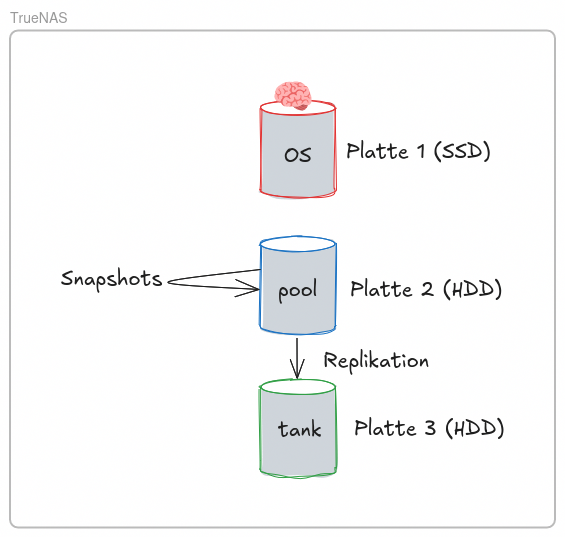 Die zu speichernden Daten befinden sich auf der Pool-Platte. Dafür nehme ich eine großvolumige HDD im Terrabyte-Bereich. Der Tank ist eine Kopie der Pool-Platte und ist ebenfalls eine gleichgroße HDD. Er wird über einen Replikations-Job beschrieben.