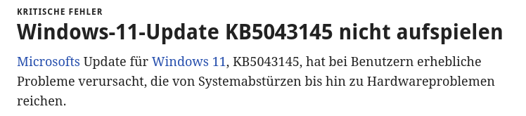Wenn mir von Windows Update z.B. ein KB5043145 "angeboten" wird, dann suche ich diese Nummer als erstes im Internet, mache mich schlau und spiele es anschließend NICHT ein: