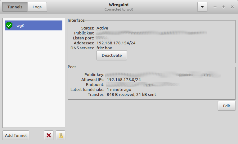 Anschließend generierte ich in der Fritzbox eine wireguard Konfigurationsdatei, nannte sie in "wg0.conf" um und lud sie mit "Add Tunnel" in Wireguird (s.o.). der Tunnel ließ sich problemlos "Aktivieren". 😀