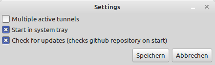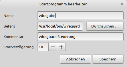 Damit die Wireguird-Anwendung automatisch startet habe ich in den "Systemeinstellungen" unter "Startprogramme" Wireguird als Anwendung hinzugefügt und so konfiguriert, daß eine Startverzögerung von 10 Sekunden eingehalten wird. Bei den "Settings" innerhalb von Wireguird habe ich eingestellt, dass das Programm im "system tray" startet: